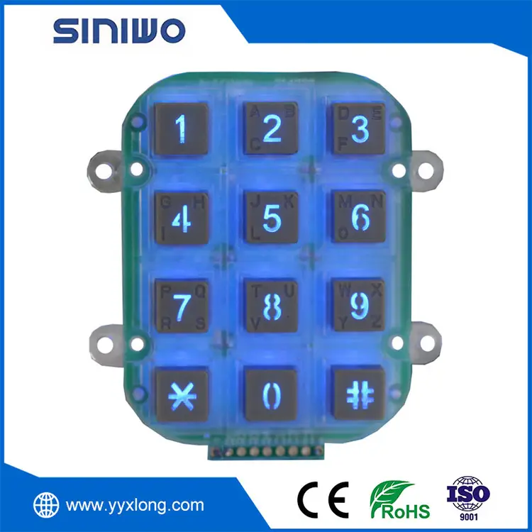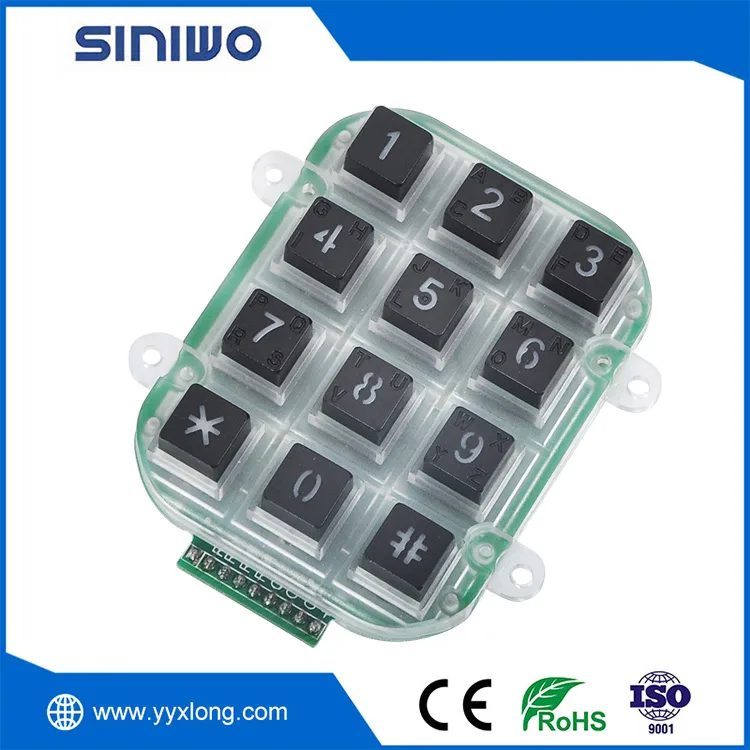 SINIWO waterproof industrial 3×4 switch keypad is a 12-key plastic keypad designed for public environments. It is widely used in vending machines, ticket machines, payment terminals, telephones, access control systems and industrial machinery. It is made of high-strength engineering plastics, has excellent impact resistance and anti-destruction performance, and has passed IP54 waterproof and dustproof certification.