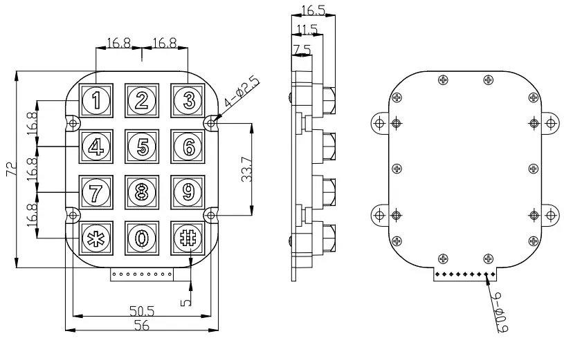 The keypad is constructed with a sealed and waterproof design to protect internal components from water, moisture, and other liquids. This is crucial for applications where the keypad may be exposed to rain, water splashes, or cleaning processes.